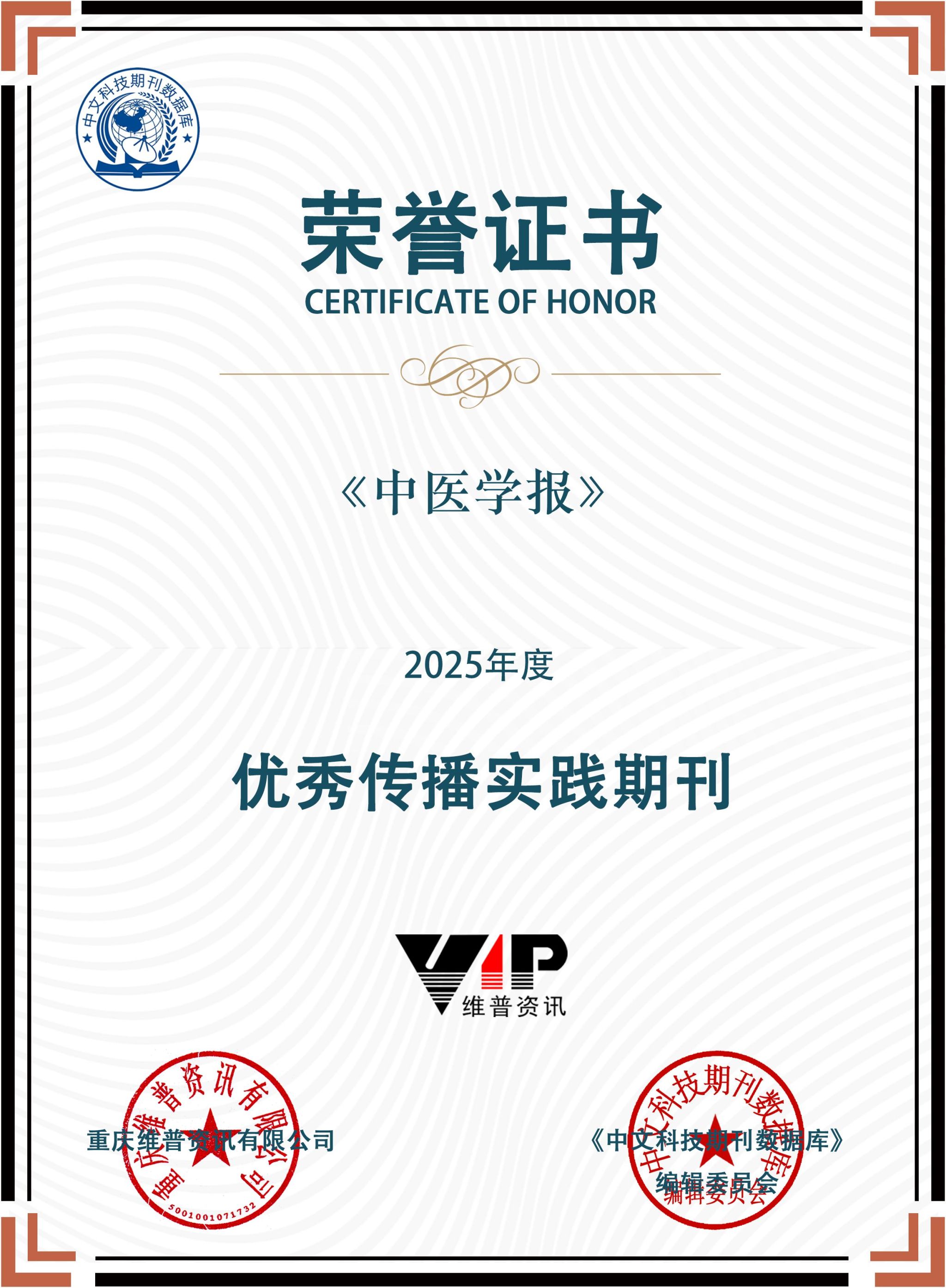 “优秀传播实践期刊”旨在表彰与维普长期深度合作、在提升期刊质量与传播效能方面取得显著成效的期刊。该奖项由中文科技期刊数据库编辑委员会提名,从质量与传播维度综合考量(基于“学术影响力卓越期刊”综合指标计算、期刊下载量等核心数据进行严格筛选)。《中医学报》获此殊荣,是对其长期坚持高质量办刊、积极拓展传播渠道、致力于推动中医药学术成果有效转化与广泛交流的充分肯定。